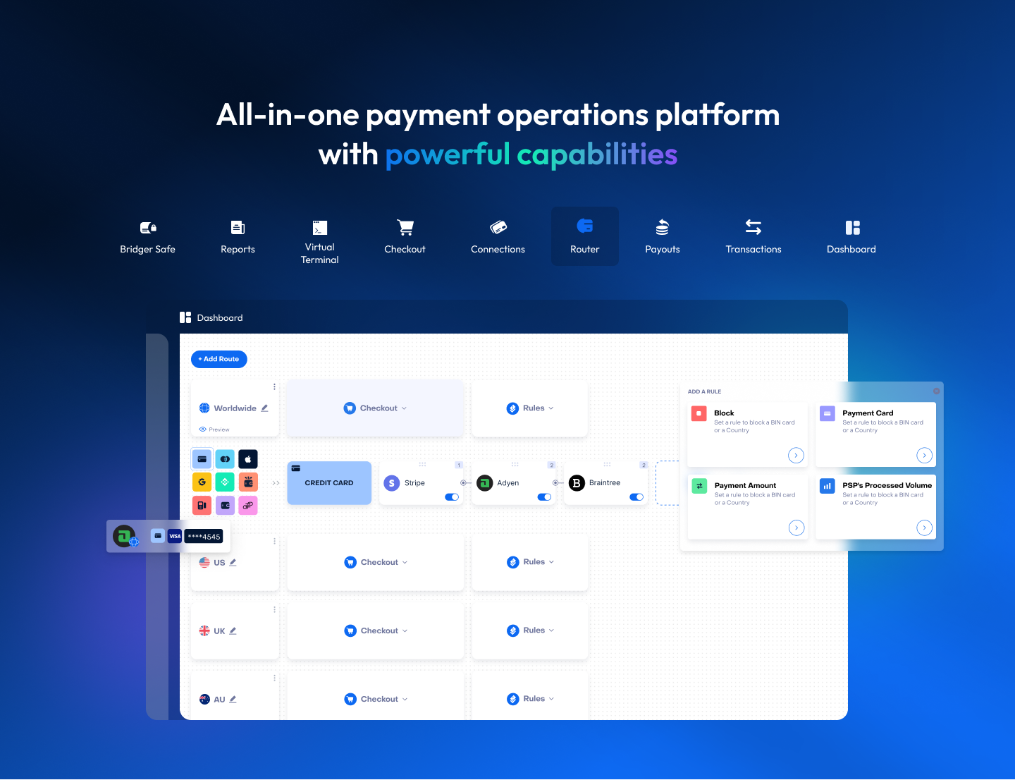 BridgerPay is the world’s first payment operations platform, built to automate ALL payment flows, empowering ANY business.
